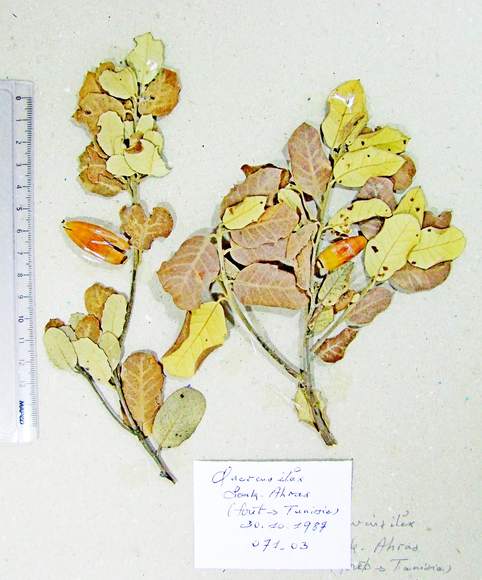 | 071_03 | Fagaceae Quercus ilex L. subsp. ballota | x=7.99975 y=36.206111 z=697 m | oued Djedra Souk Ahras 1987-10-30 |  |