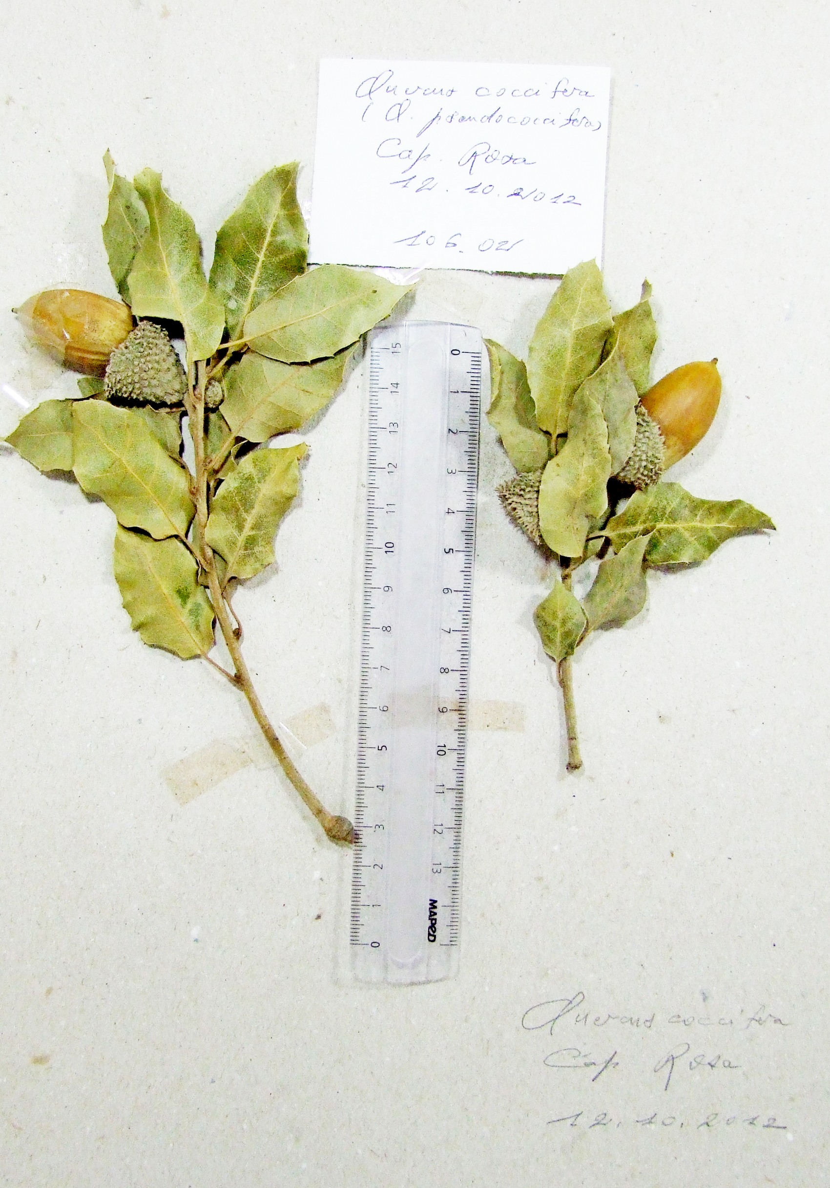| 106_02 | Fagaceae Quercus coccifera L. | x=8.236522 y=36.979114 z=107 m | cap Rosa El Tarf 2012-10-12 |  |