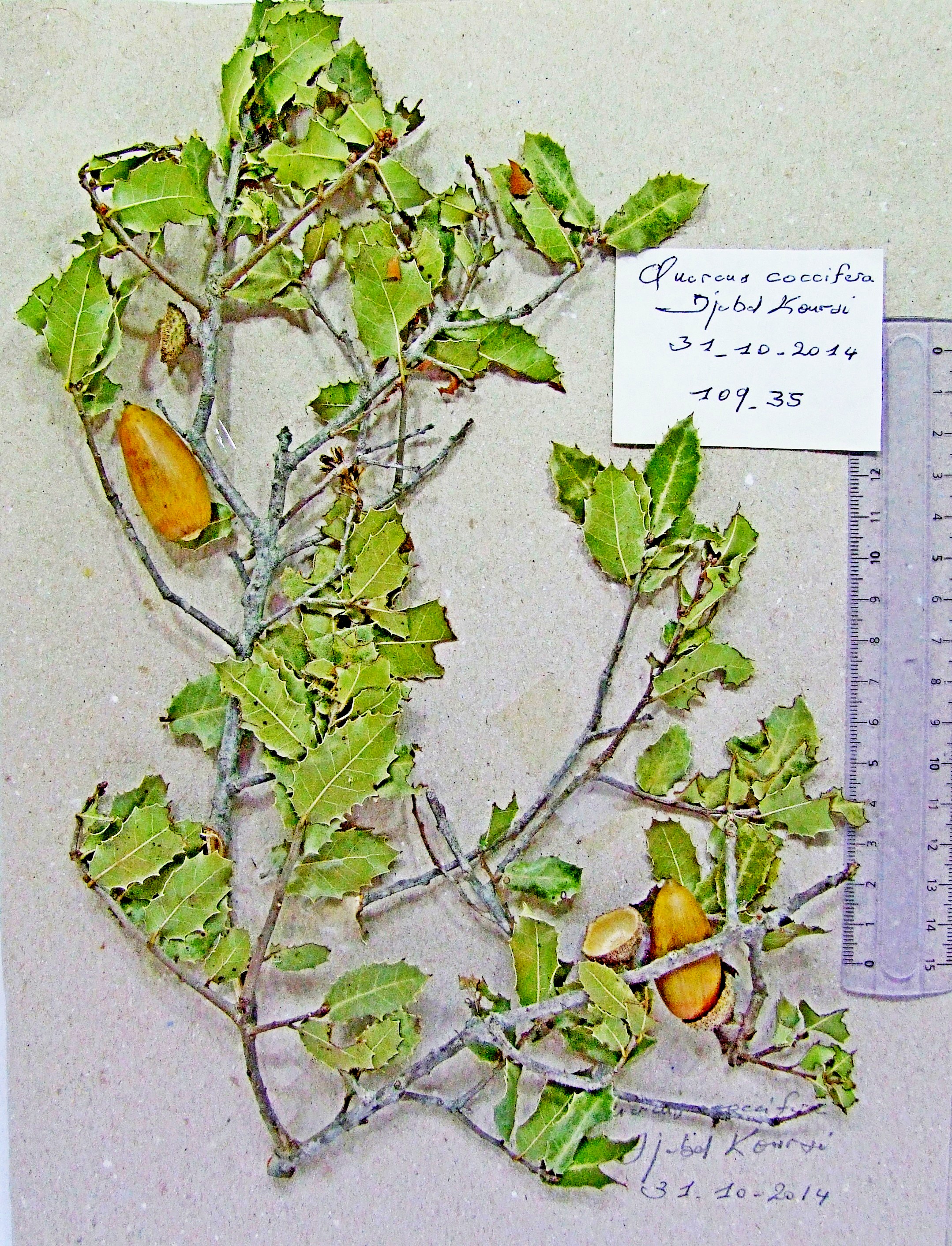 | 109_35 | Fagaceae Quercus coccifera L. | x=8.269944 y=36.865556 z=94 m | djebel Koursi 2 El Tarf 2014-10-31 |  |