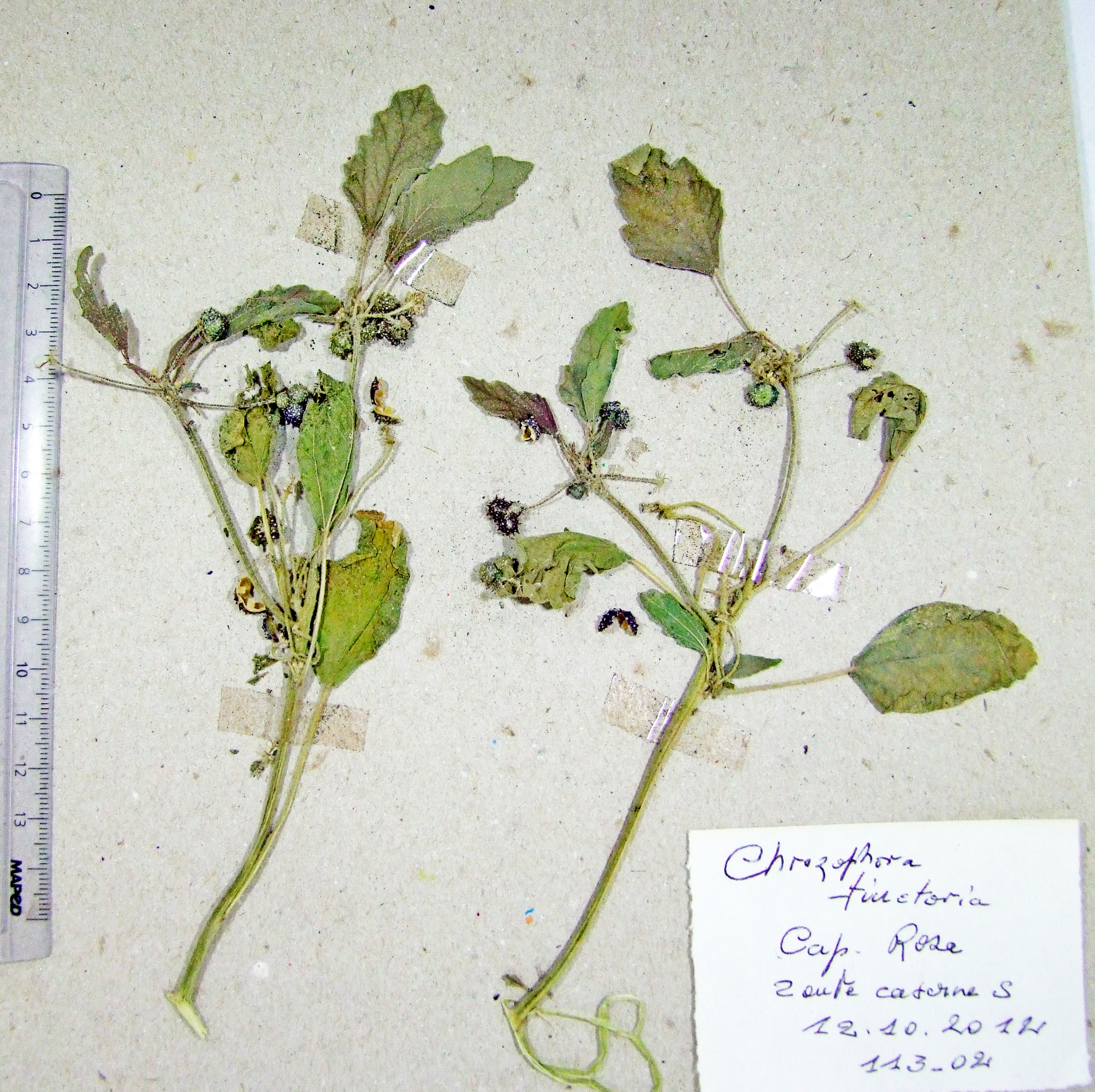 | 113_02 | Euphorbiaceae Chrozophora tinctoria (L.) A. Juss. | x=8.236522 y=36.979114 z=107 m | cap Rosa El Tarf 2012-10-12 |  |